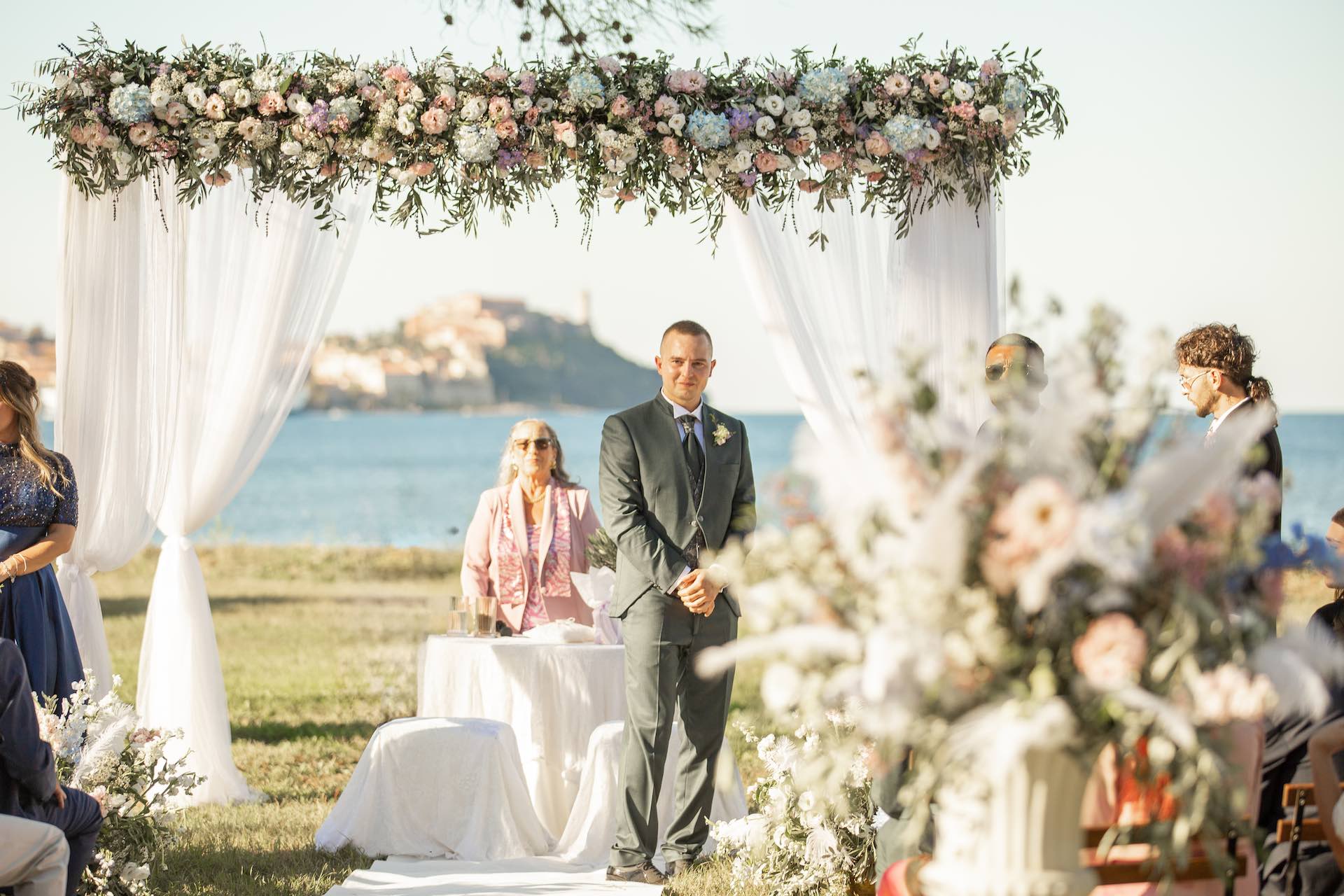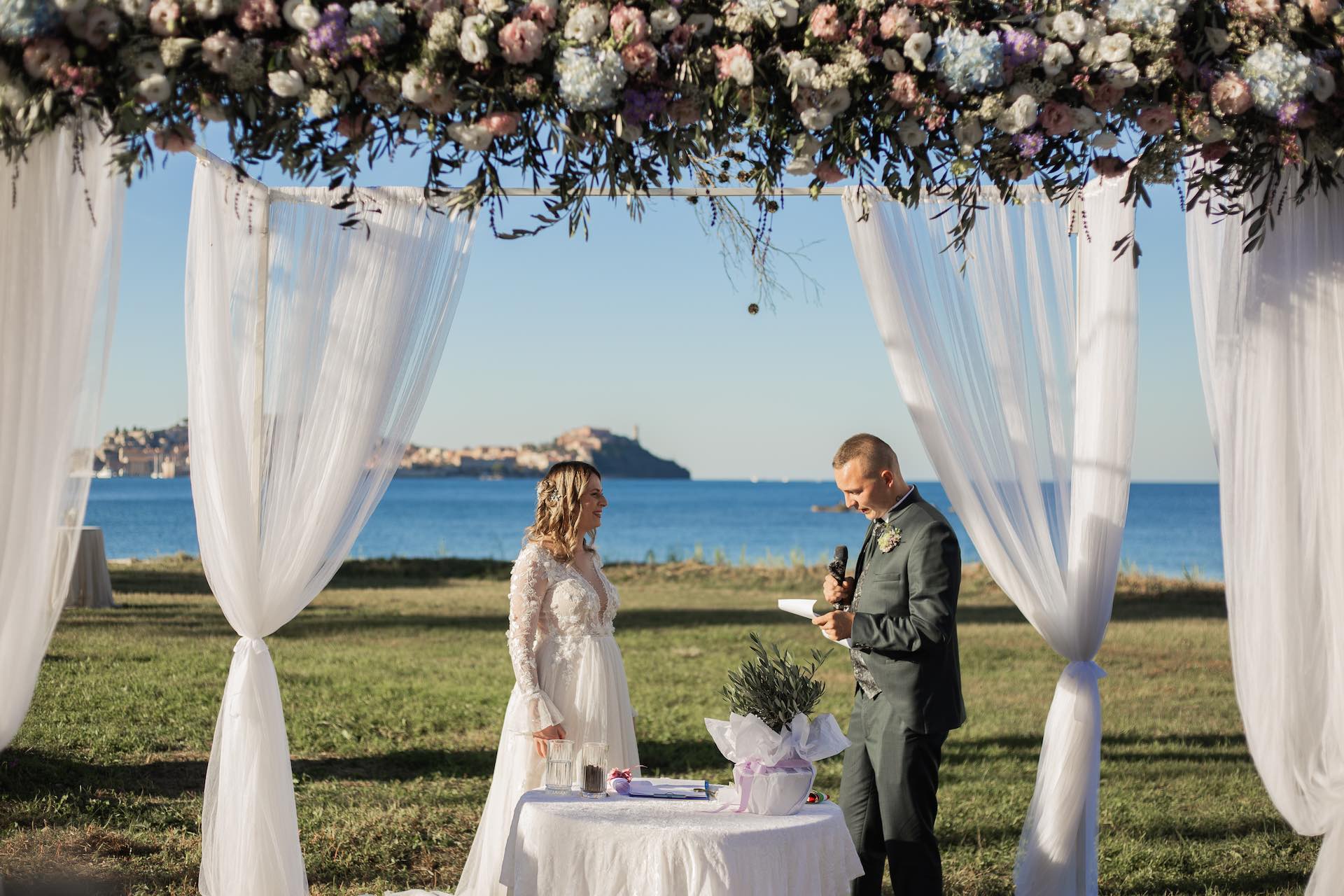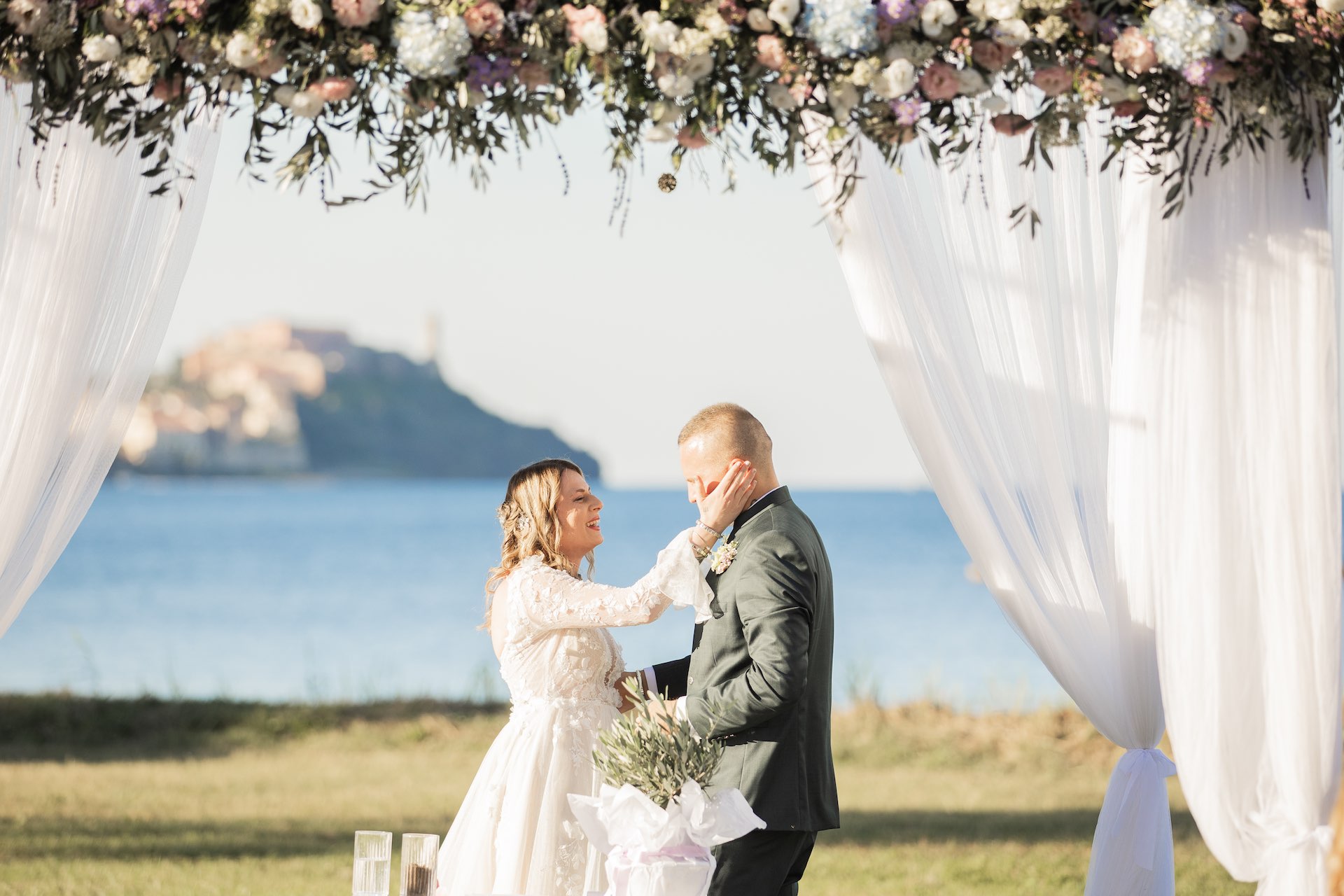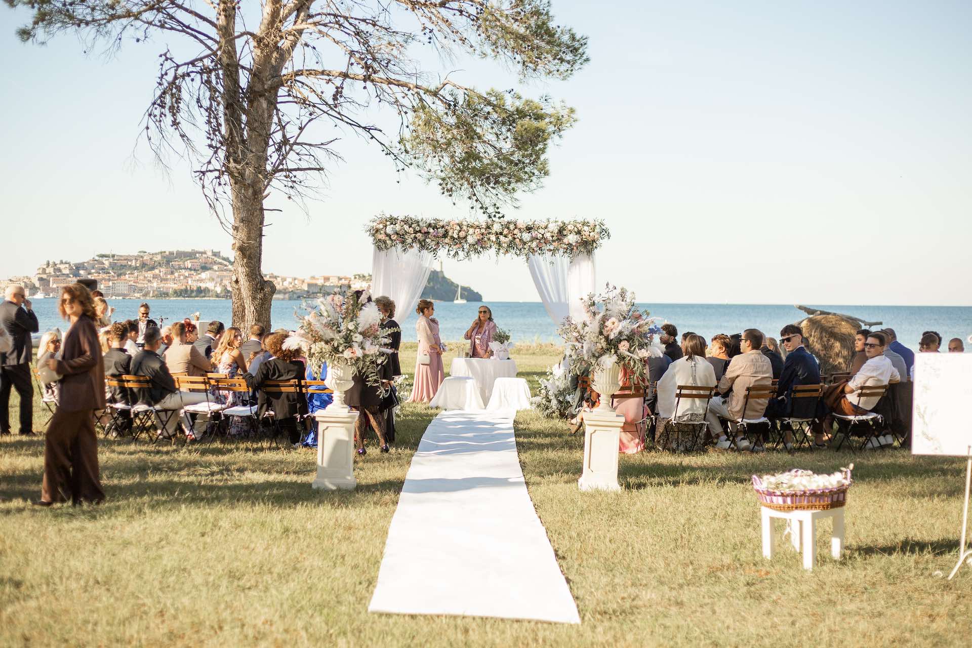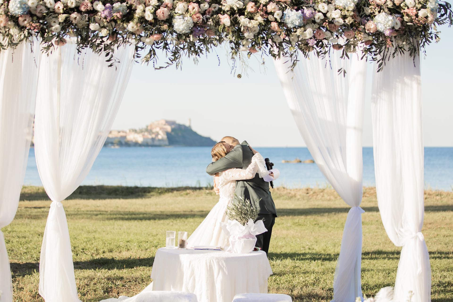 L’Elba, la più grande delle sette isole della Toscana, è il “Luogo del Cuore” per molte coppie che decidono di convolare a nozze perché i suoi paesaggi sono unici e capaci di regalare profumi e colori diversi in ogni stagione dell’anno. Milena e Vlad, una giovane coppia dell’Isola d’Elba, ha scelto di celebrare il matrimonio in un terreno conosciuto come Podere I Sassi che si affaccia sul Golfo di Portoferraio, e il Ristoro Montefabbrello, un agriturismo che profuma di terra, olivo e vigna. Dimitri, il proprietario nonché gestore, si è occupato magistralmente del catering: l’aperitivo a base di prelibatezze cucinate con prodotti a Km 0 è stato organizzato nel Podere I Sassi al termine della cerimonia civile, mentre la cena di nozze si è tenuta al Ristoro tra luci, candele e fiori di campo. Gli sposi, sotto la mia guida di wedding planner, hanno scelto un allestimento romantico con fiori semplici la cui palette ha spaziato dai toni del celeste cenere e rosa tenue a quelli del viola chiaro, il tutto impreziosito da piume bianche. Il periodo scelto per l’organizzazione del loro matrimonio una domenica d’autunno baciata dal sole che ha celebrato e benedetto l’amore di Vlad, Milena e del piccolo Ivan. Un’esperienza unica per gli sposi e per i loro invitati che ricorderanno sempre come un matrimonio da sogno.