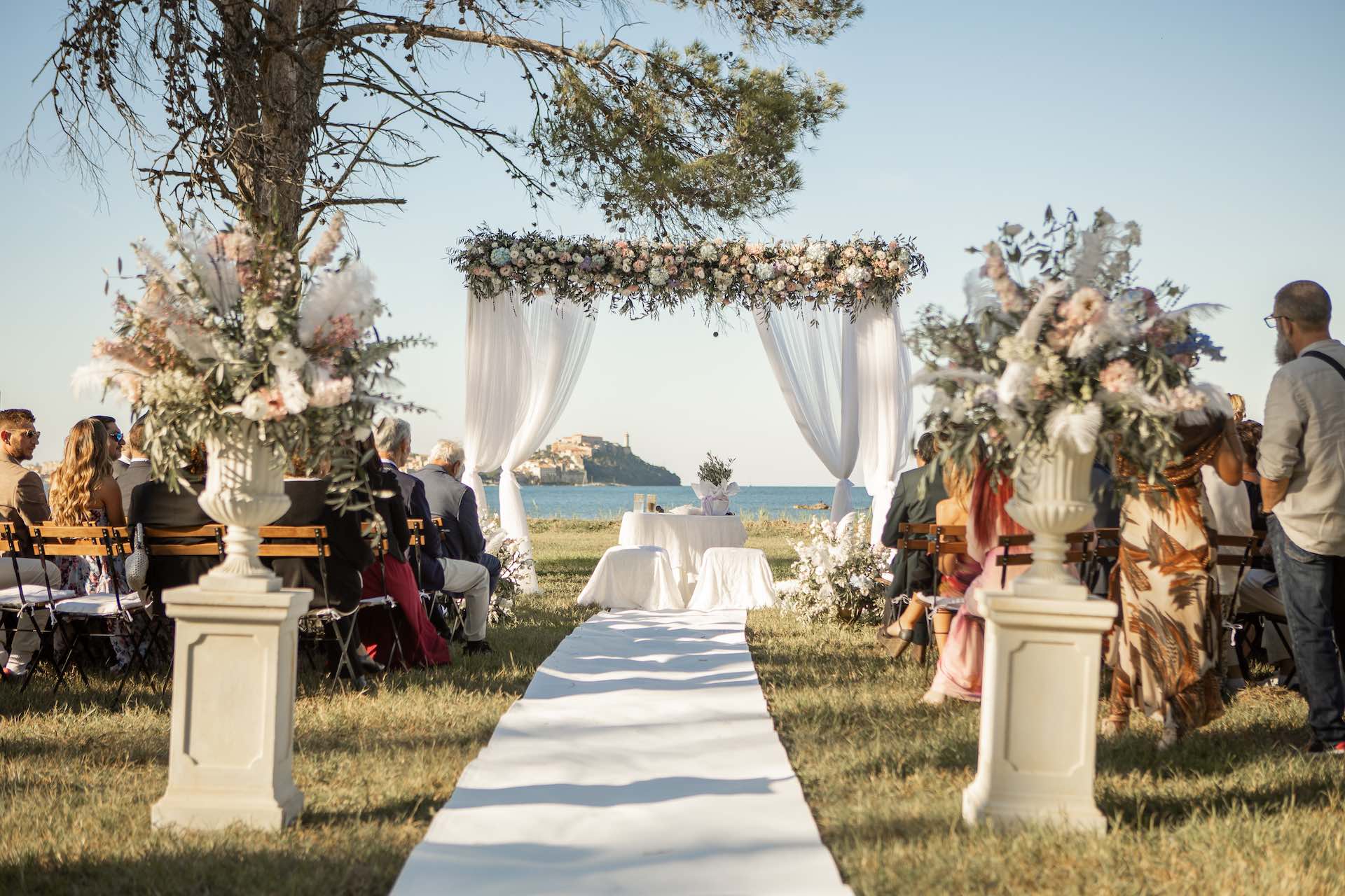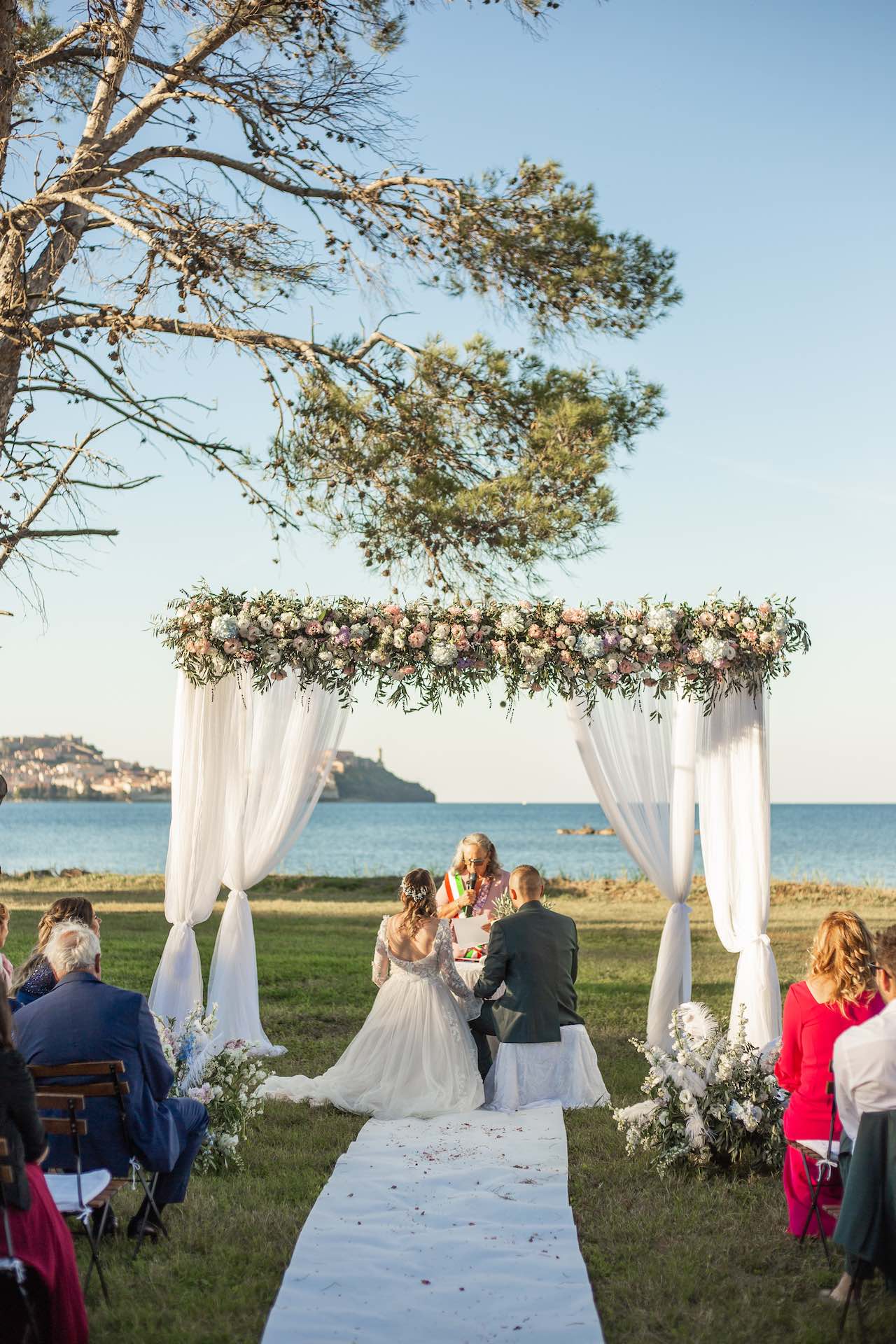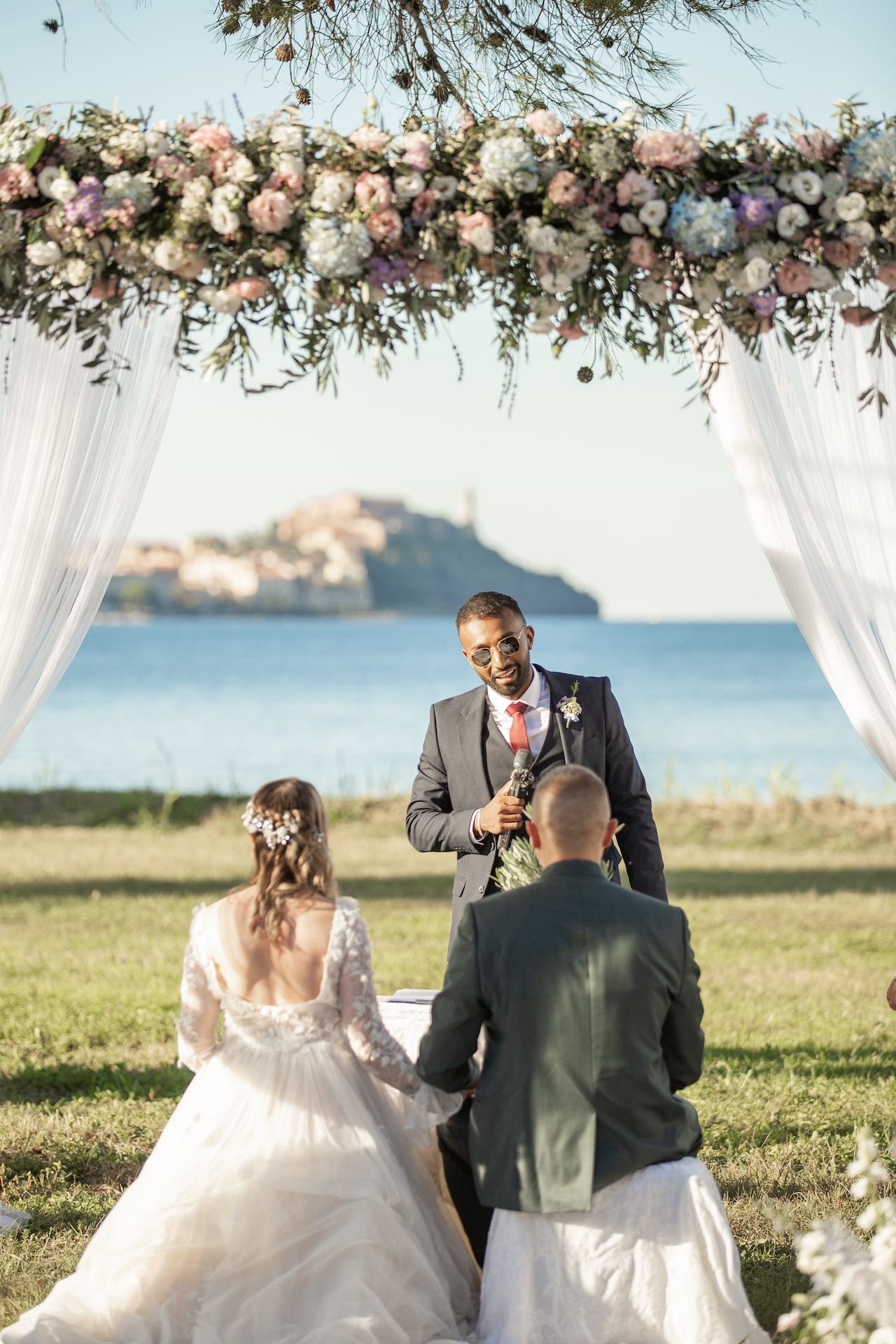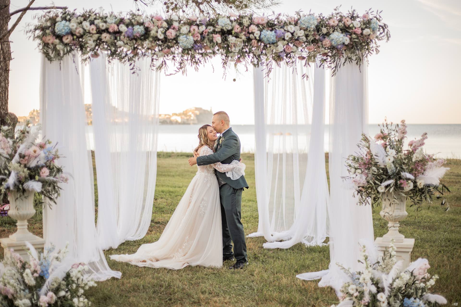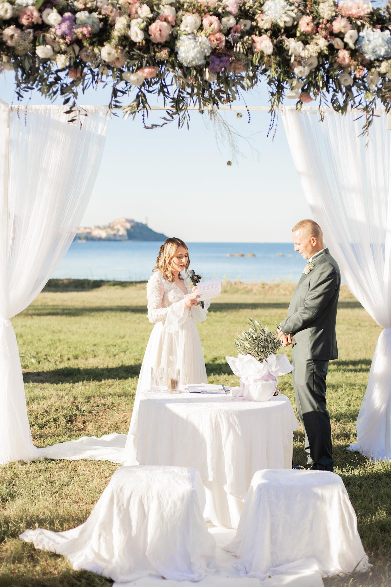 L’Elba, la più grande delle sette isole della Toscana, è il “Luogo del Cuore” per molte coppie che decidono di convolare a nozze perché i suoi paesaggi sono unici e capaci di regalare profumi e colori diversi in ogni stagione dell’anno. Milena e Vlad, una giovane coppia dell’Isola d’Elba, ha scelto di celebrare il matrimonio in un terreno conosciuto come Podere I Sassi che si affaccia sul Golfo di Portoferraio, e il Ristoro Montefabbrello, un agriturismo che profuma di terra, olivo e vigna. Dimitri, il proprietario nonché gestore, si è occupato magistralmente del catering: l’aperitivo a base di prelibatezze cucinate con prodotti a Km 0 è stato organizzato nel Podere I Sassi al termine della cerimonia civile, mentre la cena di nozze si è tenuta al Ristoro tra luci, candele e fiori di campo. Gli sposi, sotto la mia guida di wedding planner, hanno scelto un allestimento romantico con fiori semplici la cui palette ha spaziato dai toni del celeste cenere e rosa tenue a quelli del viola chiaro, il tutto impreziosito da piume bianche. Il periodo scelto per l’organizzazione del loro matrimonio una domenica d’autunno baciata dal sole che ha celebrato e benedetto l’amore di Vlad, Milena e del piccolo Ivan. Un’esperienza unica per gli sposi e per i loro invitati che ricorderanno sempre come un matrimonio da sogno.