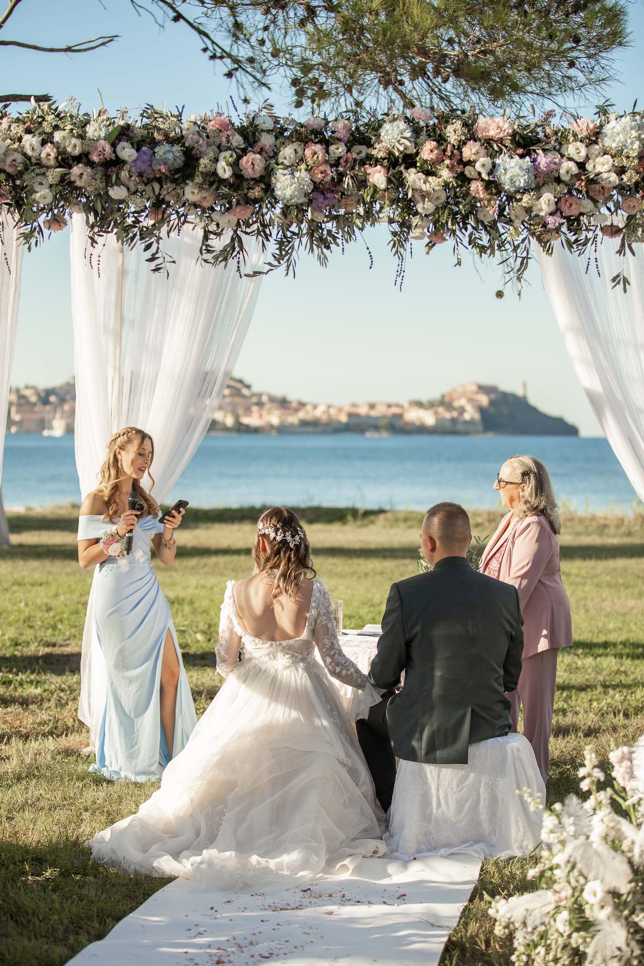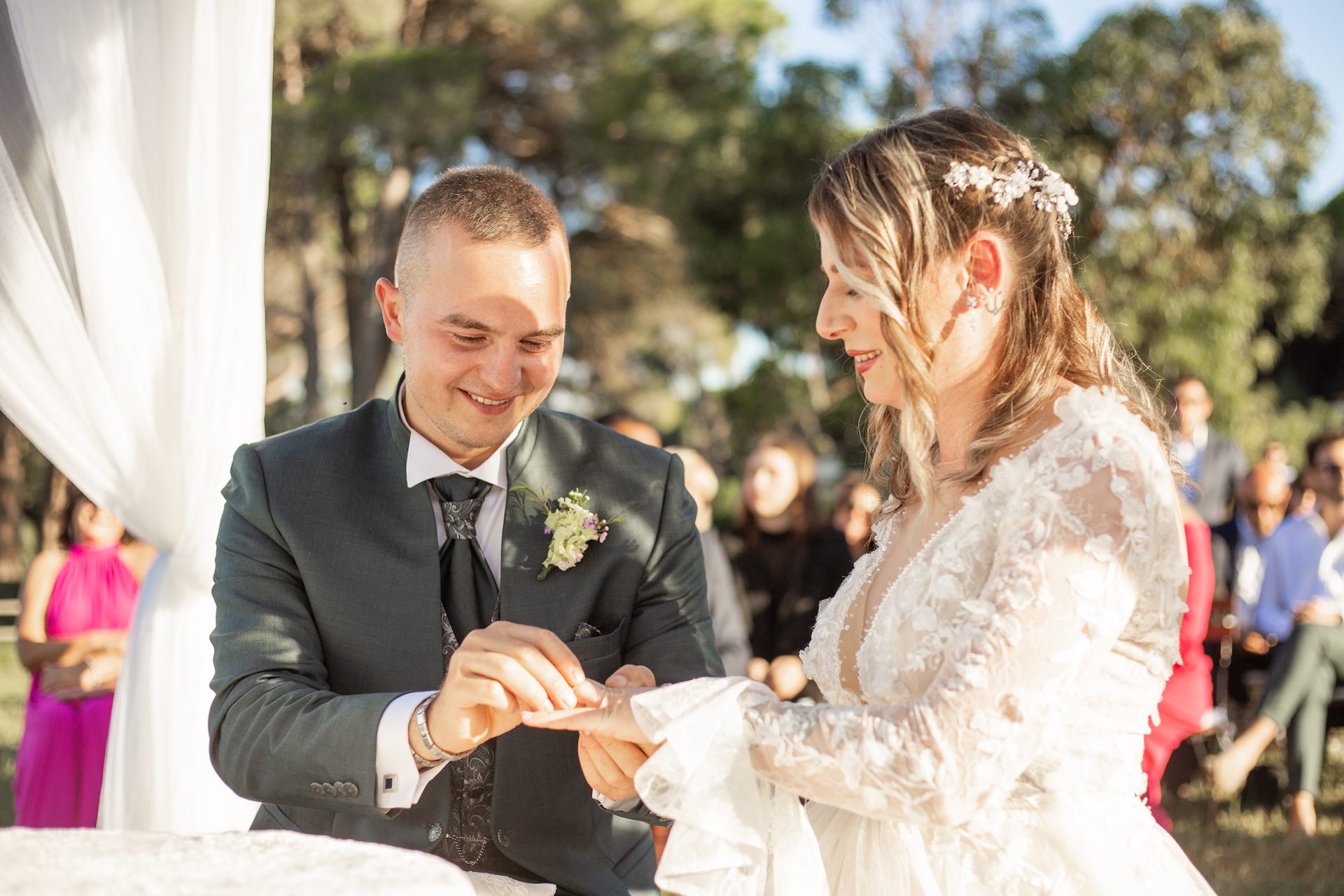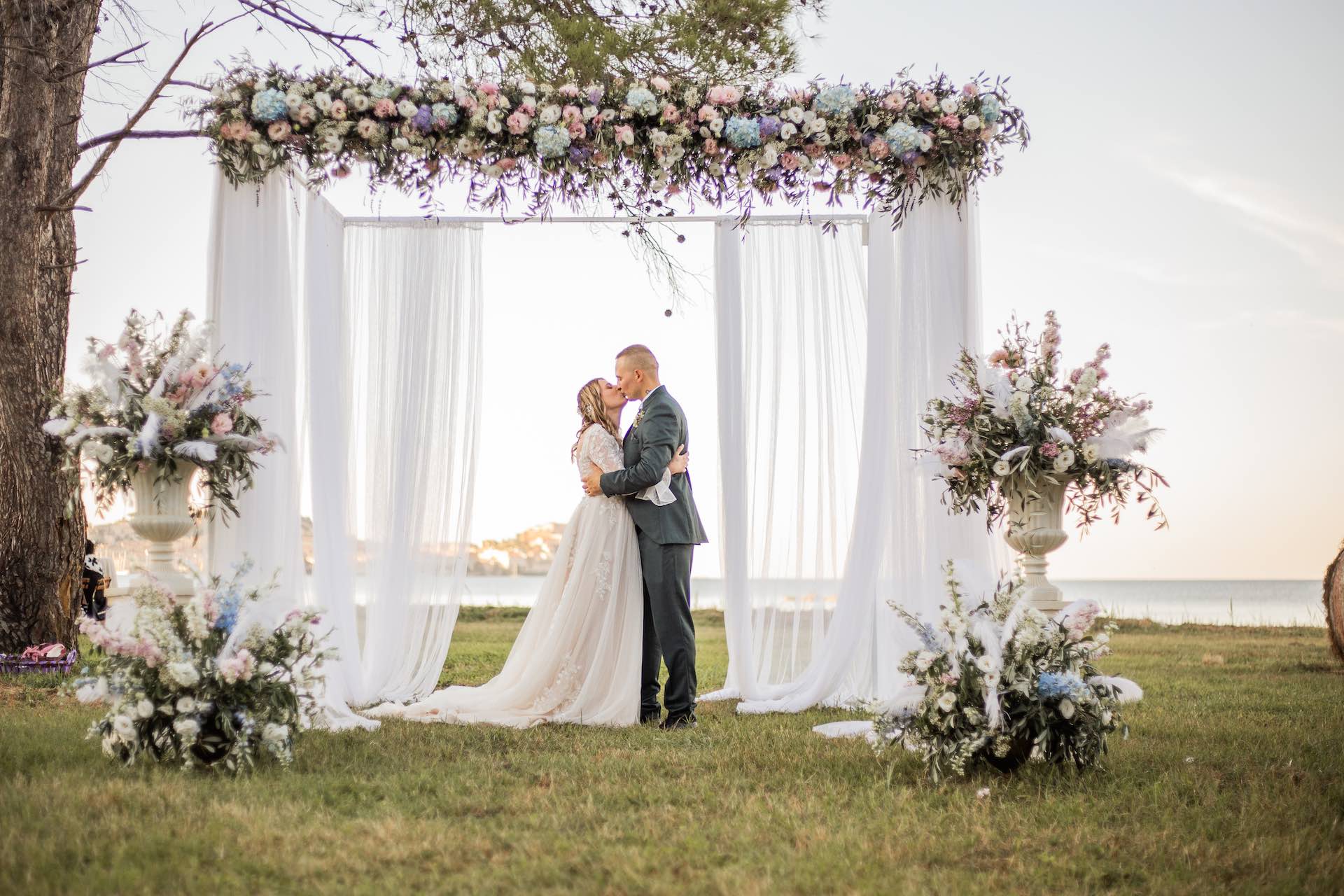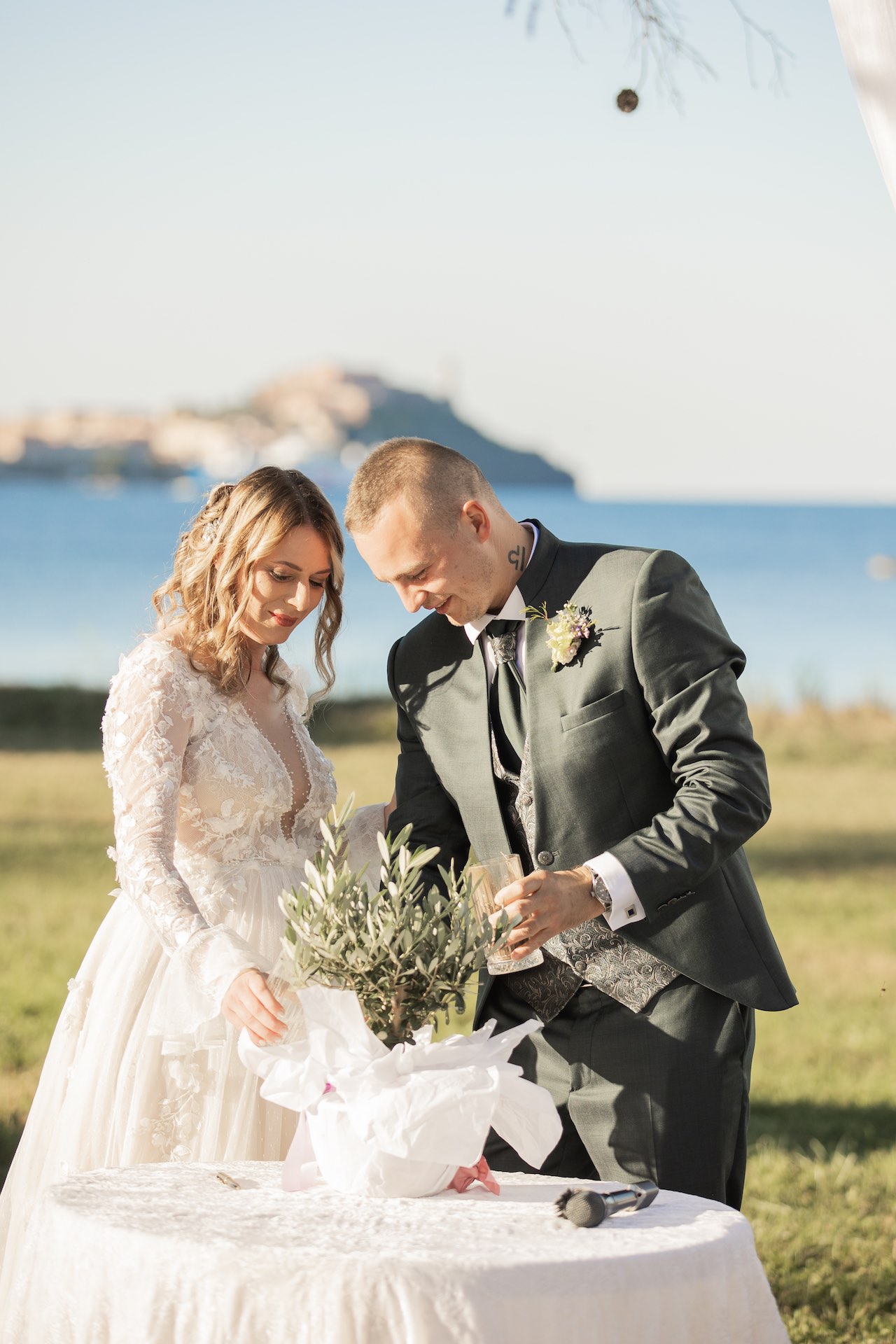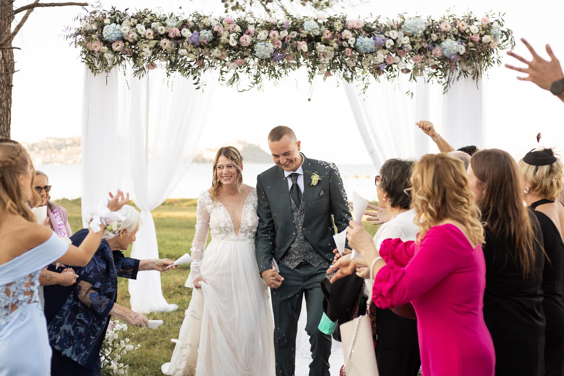 L’Elba, la più grande delle sette isole della Toscana, è il “Luogo del Cuore” per molte coppie che decidono di convolare a nozze perché i suoi paesaggi sono unici e capaci di regalare profumi e colori diversi in ogni stagione dell’anno. Milena e Vlad, una giovane coppia dell’Isola d’Elba, ha scelto di celebrare il matrimonio in un terreno conosciuto come Podere I Sassi che si affaccia sul Golfo di Portoferraio, e il Ristoro Montefabbrello, un agriturismo che profuma di terra, olivo e vigna. Dimitri, il proprietario nonché gestore, si è occupato magistralmente del catering: l’aperitivo a base di prelibatezze cucinate con prodotti a Km 0 è stato organizzato nel Podere I Sassi al termine della cerimonia civile, mentre la cena di nozze si è tenuta al Ristoro tra luci, candele e fiori di campo. Gli sposi, sotto la mia guida di wedding planner, hanno scelto un allestimento romantico con fiori semplici la cui palette ha spaziato dai toni del celeste cenere e rosa tenue a quelli del viola chiaro, il tutto impreziosito da piume bianche. Il periodo scelto per l’organizzazione del loro matrimonio una domenica d’autunno baciata dal sole che ha celebrato e benedetto l’amore di Vlad, Milena e del piccolo Ivan. Un’esperienza unica per gli sposi e per i loro invitati che ricorderanno sempre come un matrimonio da sogno.