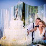 A bordo piscina un gazebo simboleggia una barca a vela. “È possibile salire a bordo”! Due tavolette di legno invecchiato indicano on board e out shoes. Al centro del “natante” un opera d’arte, un acchiappasogni che con i suoi cristalli, foglie di ostriche e conchiglie, invita al sogno. Anima il pranzo un divertente e corale flash mob che coinvolge tutti, così come il taglio della torta sul prato con il lancio di palloncini. Un sole infuocato sta per salutare il giorno. La festa non è ancora finita. Sull’arenile dorato della Biodola una doppia distesa di candele accompagna gli invitati al Ristorante Maitù, dal quale ammirano un meraviglioso tramonto sull’isola di Capraia e si scatenano fino all’alba. Tania e Stefano mi sono entrati nel cuore, così come le loro splendide famiglie. Ancor oggi, a distanza di quasi un anno dal loro matrimonio, gli elbani li sono grati per aver portato con il loro Amore e la loro naturalezza l’isola d’Elba alla ribalta mondiale. Il nostro augurio? Vederli navigare nelle acque di quest’Isola che li ha fatti così tanto innamorare.